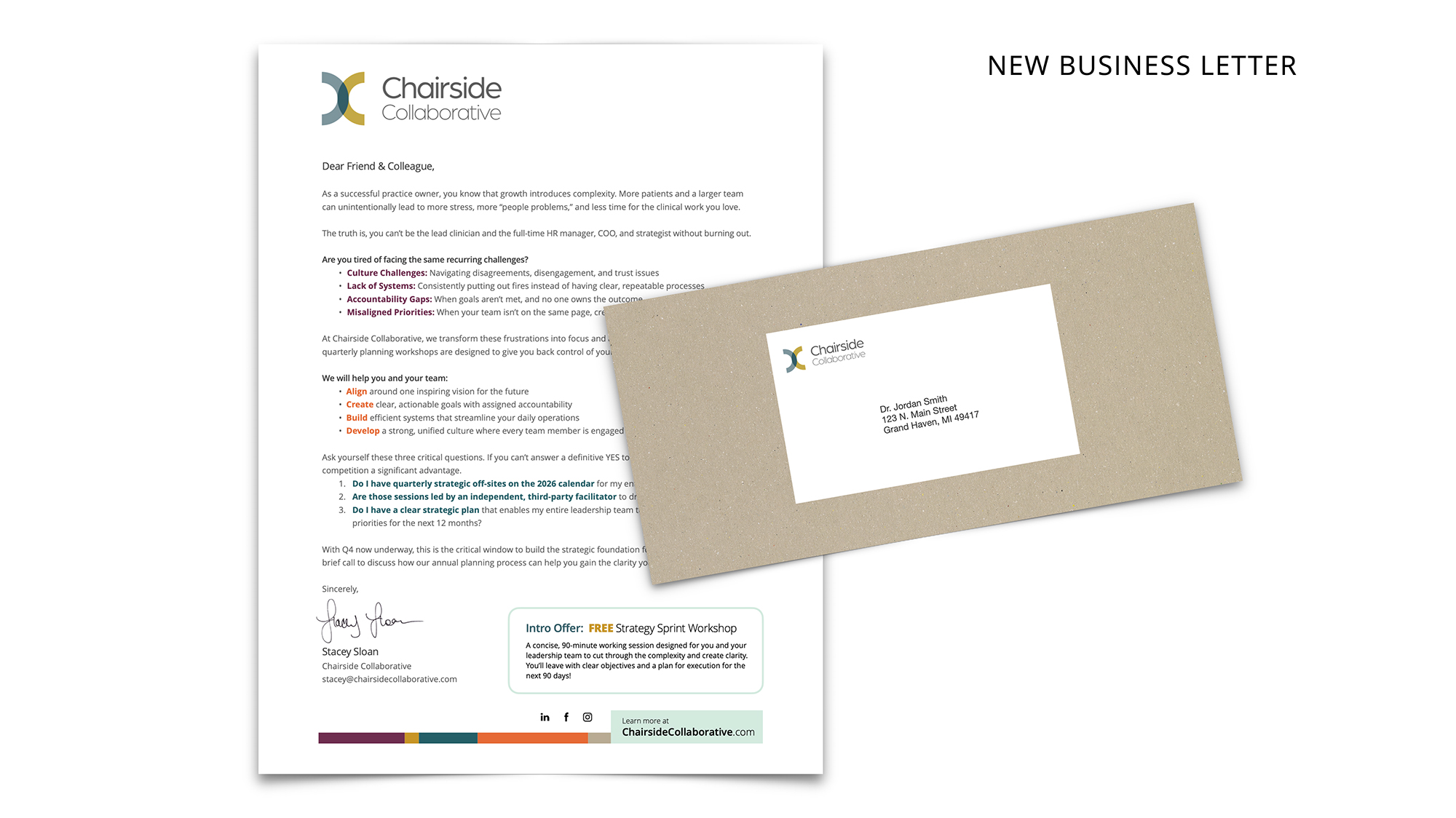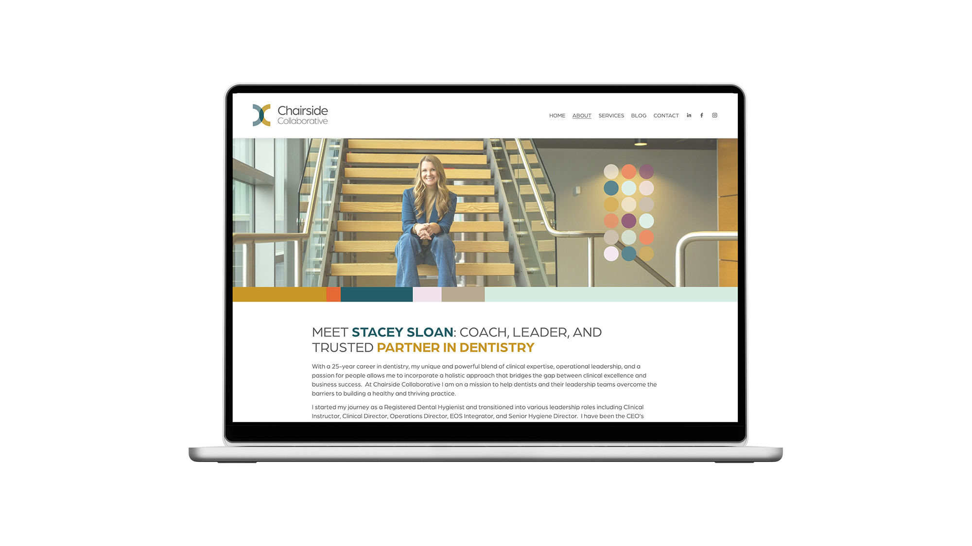 Having started her career working “chairside” as a hygienist, the parallel to her new coaching role quickly became clear. After landing on the name Chairside Collaborative, I set out to develop a brand identity that captured both Stacey’s expertise and her approachable, grounded personality.